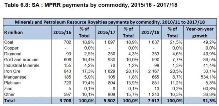 Recent Tax Statistics jointly published by the National Treasury and SARS show that the revenue collected in the 2017/18 financial year for mining and petroleum royalties was a total of R7,617-million, and R8,612-million in the 2018/19 financial year.